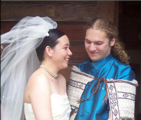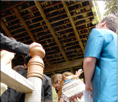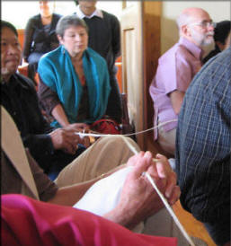 Erik ties a piece of the string used in the ceremony, around Rachael's wrist