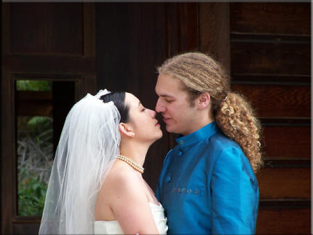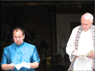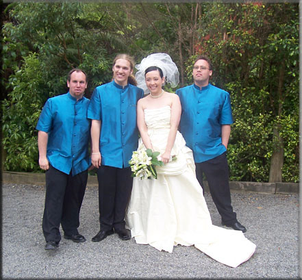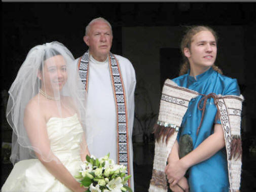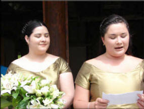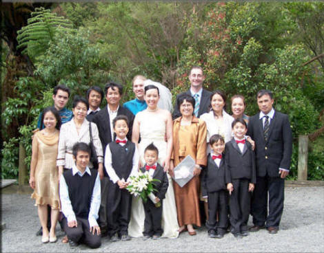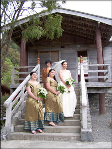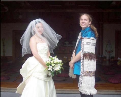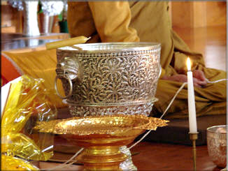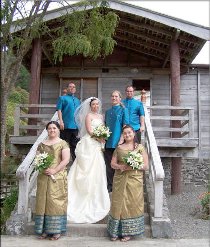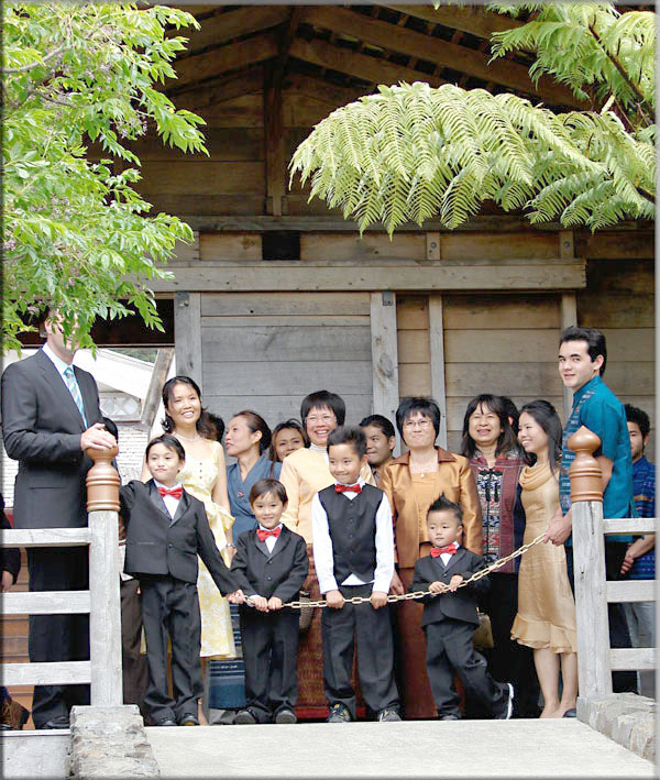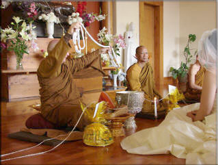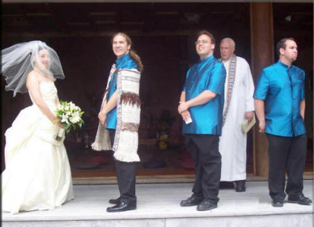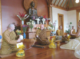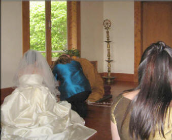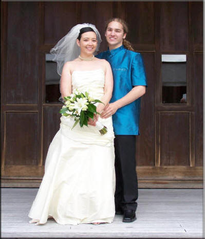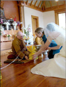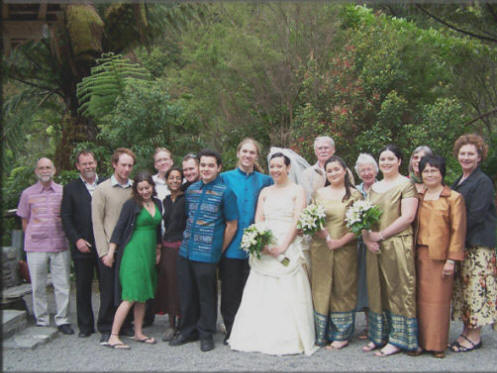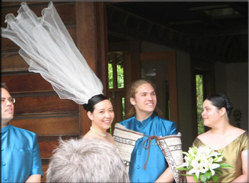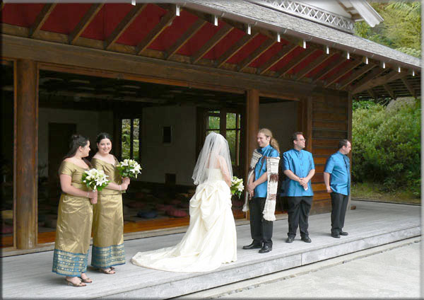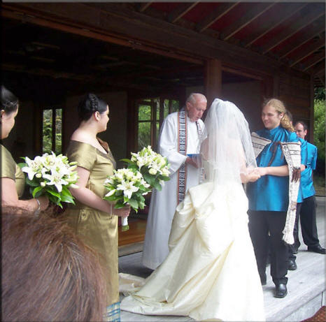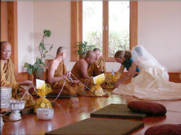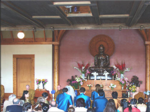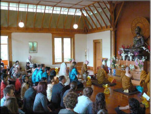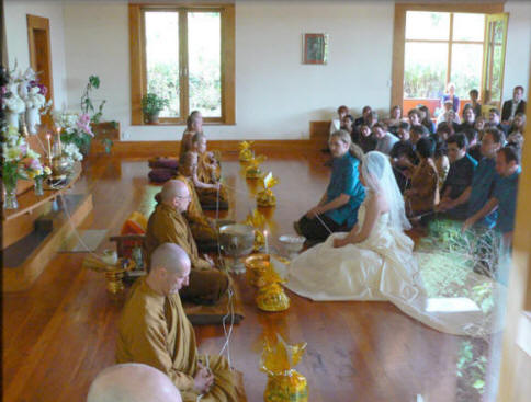 Everyone then moved into the Temple to be received by the Monks who performed a Buddhist ceremony and blessing of the newly married couple. |